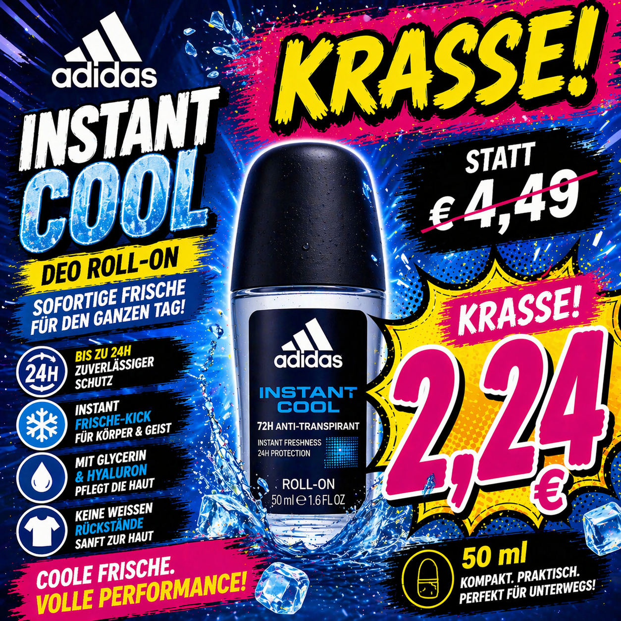 Sofortige Frische für den ganzen Tag: Der Adidas Instant Cool Deo Roll-On sorgt für einen erfrischenden Cooling-Effekt und bietet bis zu 24 Stunden zuverlässigen Schutz vor Schweiß und Geruch. Die hautfreundliche Formel mit pflegenden Inhaltsstoffen zieht schnell ein, hinterlässt keine Rückstände und ist ideal für den täglichen Einsatz – perfekt für aktive Männer.