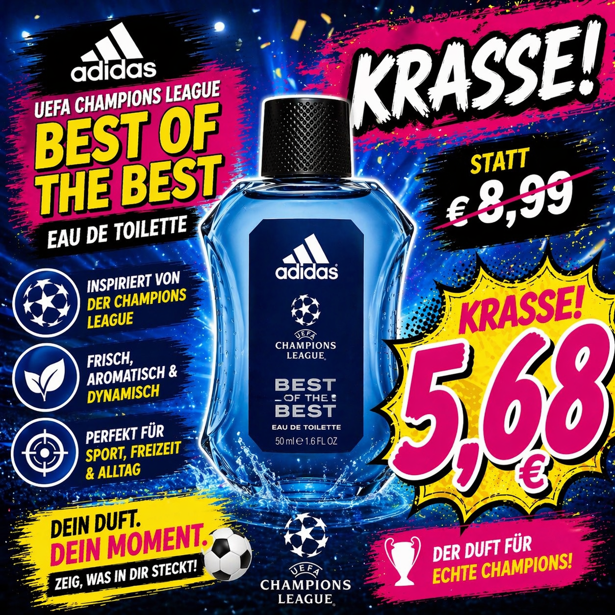 Der Duft für Gewinner: Das Adidas UEFA Champions League „Best Of The Best“ Eau de Toilette überzeugt mit einer frischen, aromatischen und dynamischen Duftkomposition. Inspiriert von der Energie des Spitzenfußballs sorgt dieser Duft für einen kraftvollen Auftritt im Alltag, beim Sport oder in der Freizeit. Leicht, maskulin und ideal für den täglichen Einsatz – für alle, die das Beste aus sich herausholen wollen.