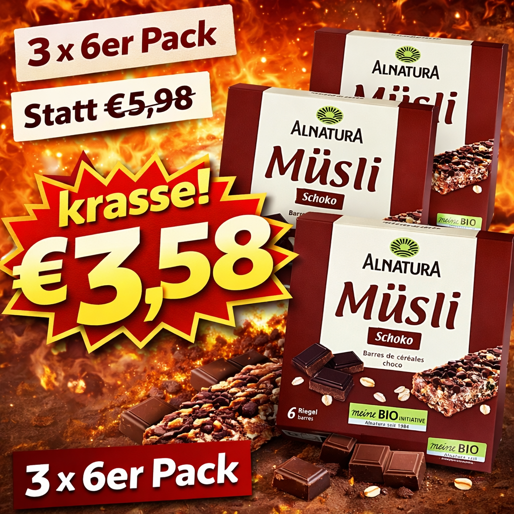 Haferflocken*, Glukosesirup*, Zartbitterschokolade* (Kakaomasse*, Rohrzucker*, Kakaobutter*), Reismehl*, Weizenflocken*, Sonnenblumenöl*, Honig*, Magermilchpulver*, Kakao*, Salz