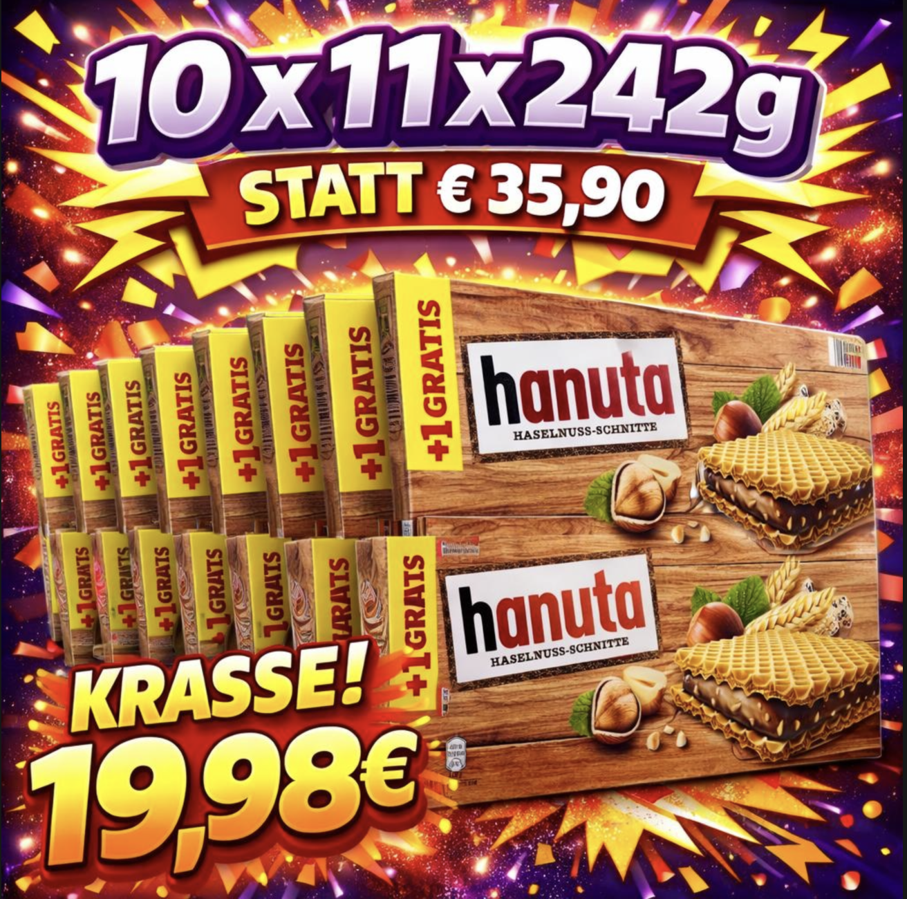 Zutaten: Zucker, pflanzliche Fette (Palm, Shea), WEIZENMEHL (13,5 %), HASELNÜSSE (13 %), SÜSSMOLKENPULVER, fettarmer Kakao, VOLLMILCHSCHOKOLADE (Zucker, VOLLMILCHPULVER, Kakaobutter, Kakaomasse, Emulgator Lecithine (SOJA), Vanillin), MAGERMILCHPULVER, BUTTERREINFETT, Salz, Halbbitterschokolade (Zucker, Kakaomasse, Kakaobutter, Emulgator Lecithine (SOJA), Vanillin), Emulgator Lecithine (SOJA), Aromen, Traubenzucker, Backtriebmittel Natriumhydrogencarbonat, Vanillin.