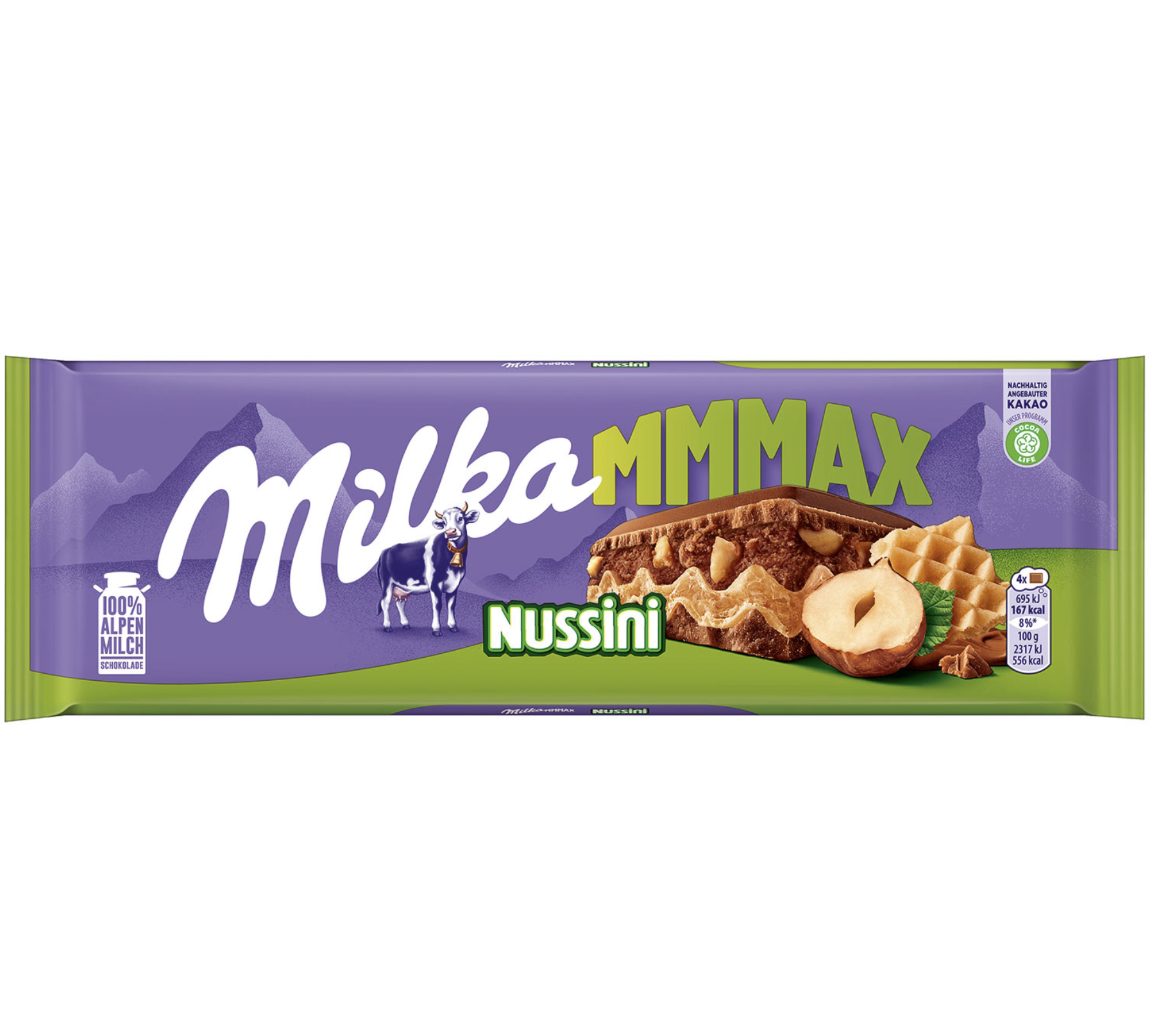 Alpenmilch Schokolade gefüllt mit einer Haselnusscrème (40%), mit Haselnussstückchen (2%) und Waffel (4%).