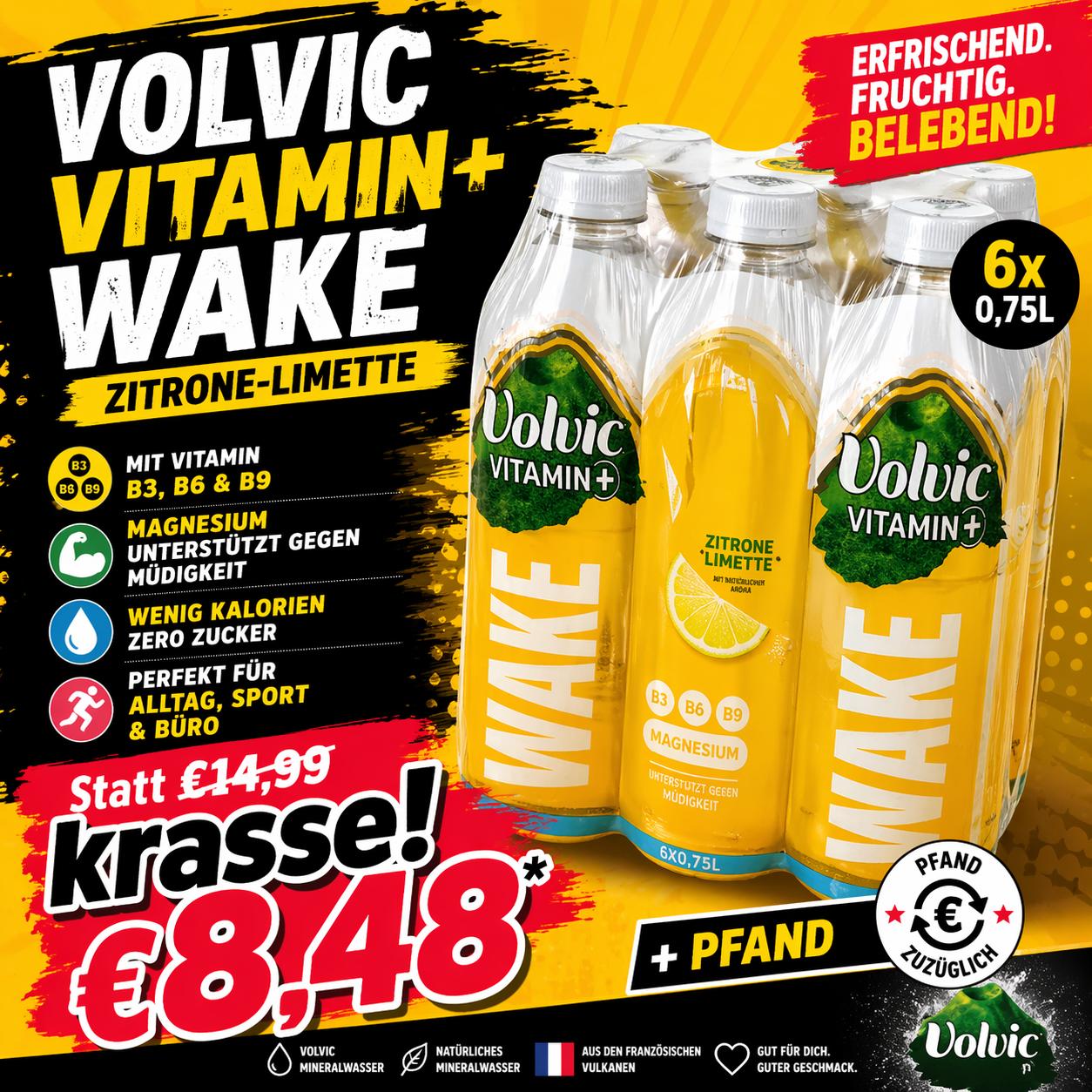 Der perfekte Frischekick für deinen Tag: Volvic Vitamin+ Wake Zitrone-Limette belebt mit spritzigem Citrusgeschmack und wertvollen Vitaminen. Die Kombination aus natürlichem Mineralwasser, Magnesium und den Vitaminen B3, B6 und B9 unterstützt deinen Körper aktiv im Alltag.