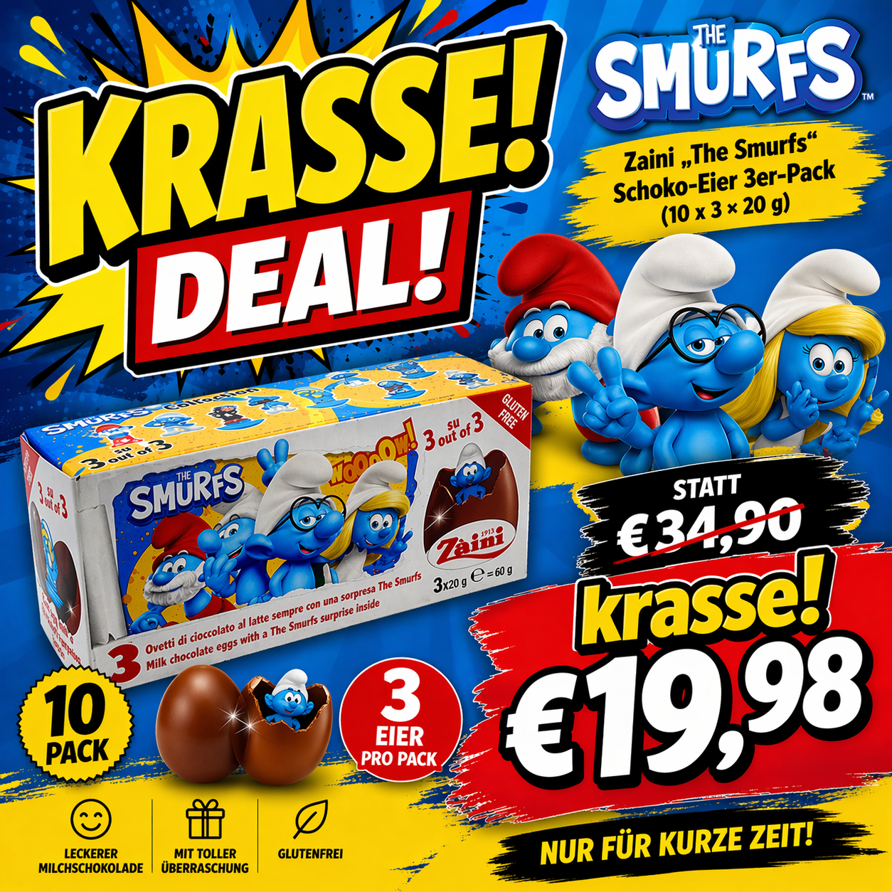 Mit dem Zaini „The Smurfs“ Schoko-Eier Vorteilspack bekommst du gleich 10 Packungen à 3 köstliche Milchschokoladen-Eier – jedes mit einer kleinen Überraschung im Inneren.